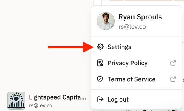 Click into your company logo in the bottom left corner of the homepage, and then navigate to Settings in order to update the My Details and My Company sections. Keep in mind this information will be visible to lenders if you send them the Lev Deal Room. Additionally, you'll note the email signature text box does not include the ability to add logos, photos, nor rich text -- this is by design, to ensure your outreach emails aren't caught in lender firewalls.
